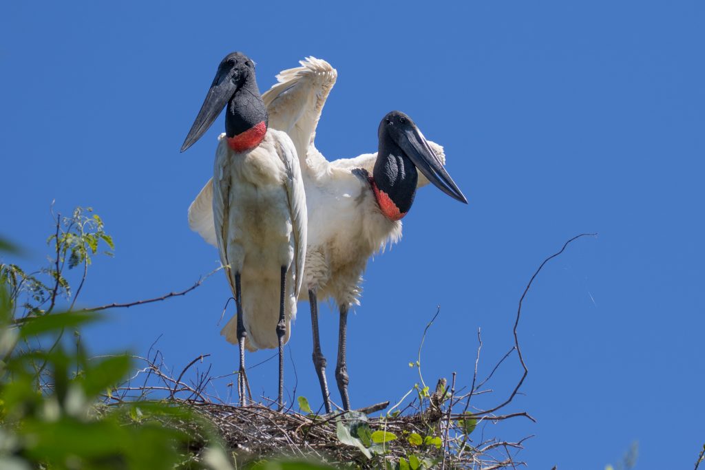 The Jabiru (or Yabiru in Argentina) is the tallest flying bird in the Americas and males can stand as high as 1.5m. Their range in South America extends from Mexico to Argentina and although locally common in a few places they are in decline. They are found in wetlands such as the Esteros del Ibera, Pantanal and favour freshwater marshland and shallow water in which to hunt. They feed on a wide range of prey such as reptiles, amphibians, fish, large insects and sometimes small mammals. They are a Stork from the family Ciconiidae and build huge nests in the tallest trees they can find. In our area of Ibera the trees are not very tall so the nests are quite visible. They normally lay 2 to 5 eggs which both adults brood. The young fledge at around 110 days and stay with their parents for another 3 months.
